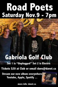 Road Poets listening party – April 6, 2024, 6:30 – 9pm at the Gabriola Theatre Centre This is public even by donation. The new album will be played and videos for a bunch of the songs will shown. Drinks and food will be avialble.